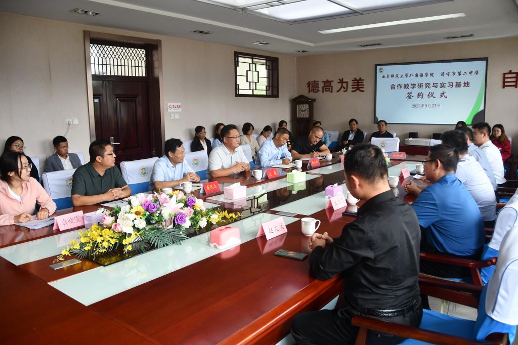 与济宁二中合作教学研究与实习基地签约仪式举行。济宁二中党支部书记、校长左磊,党支部副书记谢云剑,副校长展代立,办公室、教务处、团委负责人,济宁二中全体英语教师出席仪式,合法的赌博网站