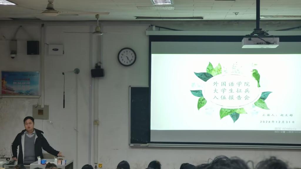于12月31日于系楼101组织2022级、2023级、2024级全体本科生召开征兵入伍宣讲会,并由2022级辅导员赵文彬进行宣讲。