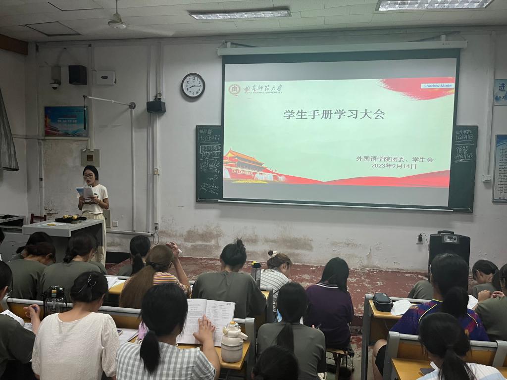 团委宿管部部长华硕、团委卫生健康部部长杨子贤为新生们讲解了学院宿舍管理制度及卫生管理制度,详细地解释了每一条规定,帮助新生们尽快养成良好生活习惯,助力新生适应大学生活;9月14日,学生会主席李燕妮、副主席孙炜阳带领新生们认真学习了《曲阜师范大学学生手册》,李燕妮从教学教务管理、学生军训管理、公寓管理规定、心理健康咨询等方面进行详细讲解,向新生们解答了选课、保险等问题,进一步帮助新生提升自律自省意识,规范个人行为。