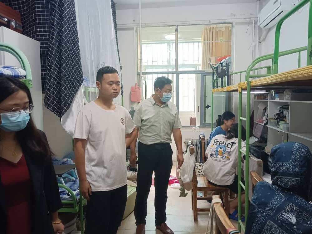 8月27日上午,2021级同学基本上已返校完毕。党委副书记王作茂带领2021级辅导员王仁杰等一众老师共同前往西公寓二号楼视察宿舍回迁工作,感谢同学们在此次行李回迁工作中的辛苦付出,同时鼓励同学们在更好的宿舍环境中创造更加优异的成绩。