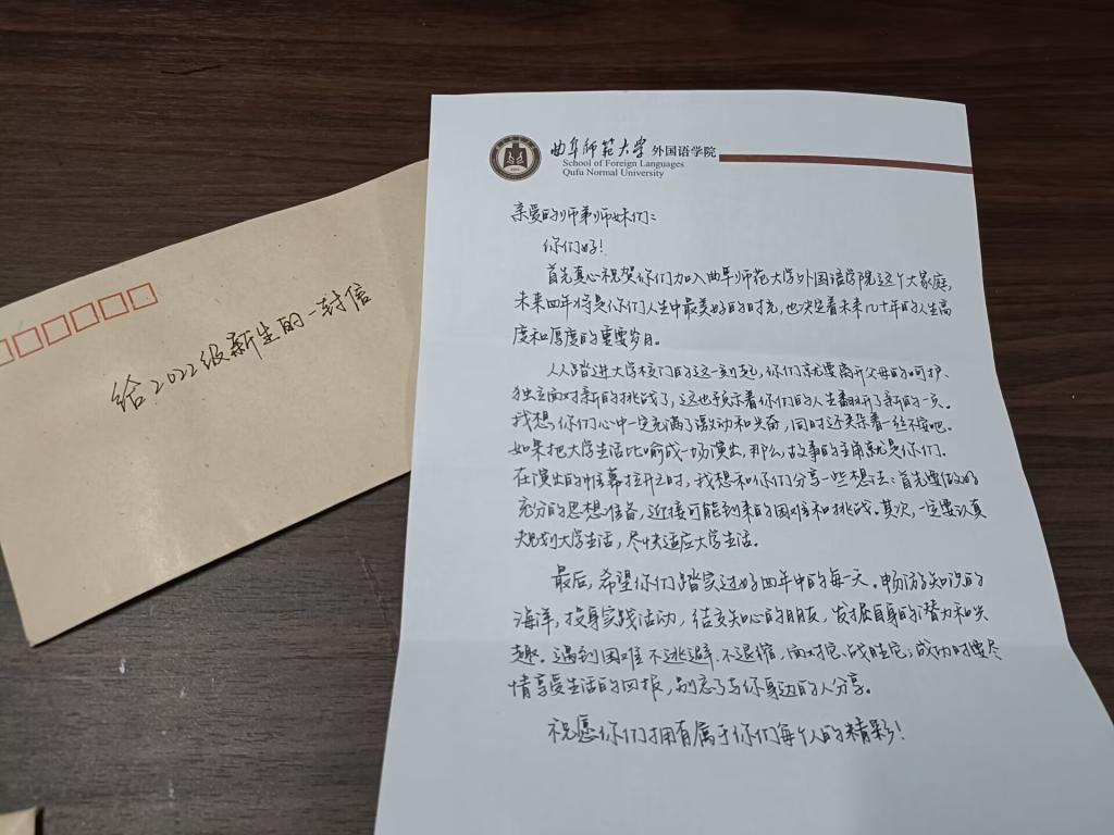 报到第一天,新生陆陆续续进入宿舍,刚进门就发现信封静静地“躺在”书桌上,信封上标记着“给2022级新生的一封信”,新生们满怀期待地打开信封。有的新生被信的内容鼓舞,立志成为像师哥师姐一样优秀的外院学子,在合法赌博网站