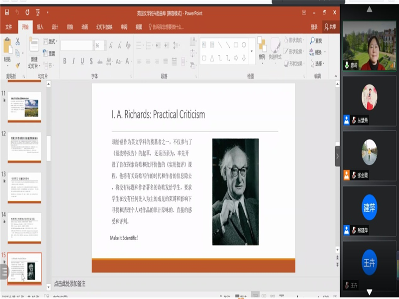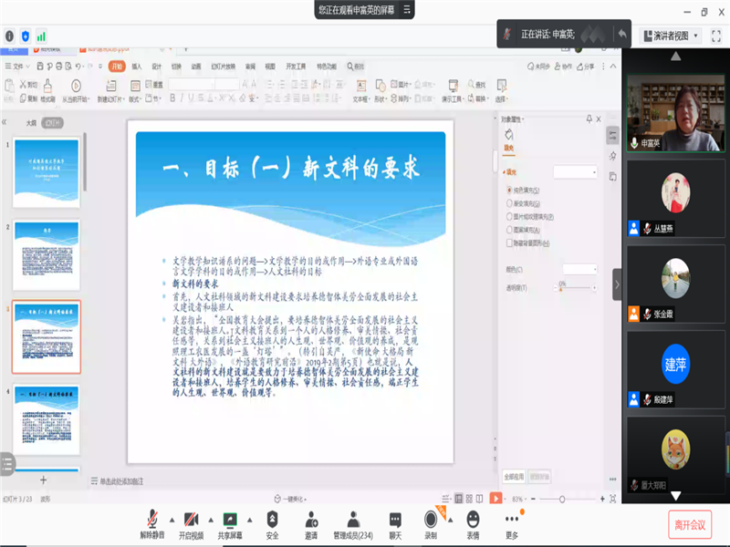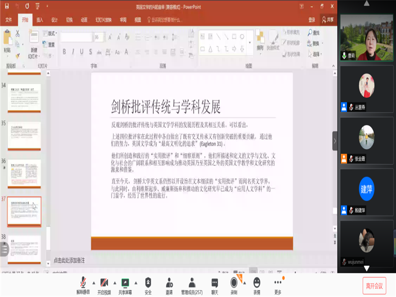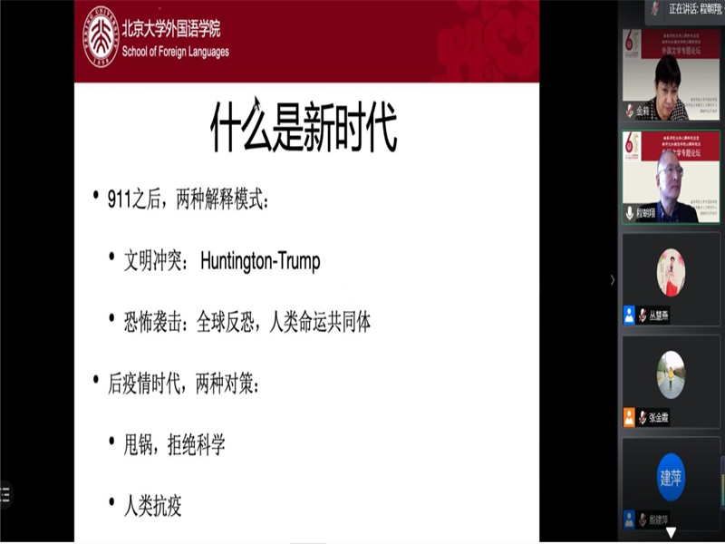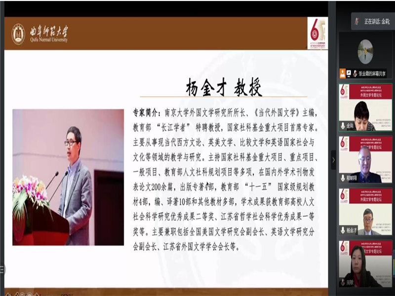 首先,南京大学的杨金才教授就新世纪外国文学的创作和发展趋势展开讲解。接着,北京大学、石河子大学的程朝翔教授对新文科与文学的关系展开深刻探讨。随后,美国爱丁堡大学的黄桂友教授就文学研究的目的性与实用性展开了专题分享。然后,杭州师范大学的周敏教授介绍了英国文化研究对外国文学课程思政的启迪。之后,清华大学的曹莉教授介绍了英国文学在剑桥大学的兴起。山东大学的申富英教授分享了新文科建设与外国文学知识谱系。最后,曲阜师范大学的林瑛副教授对本次论坛做总结发言并感谢各位专家学者的学术分享。